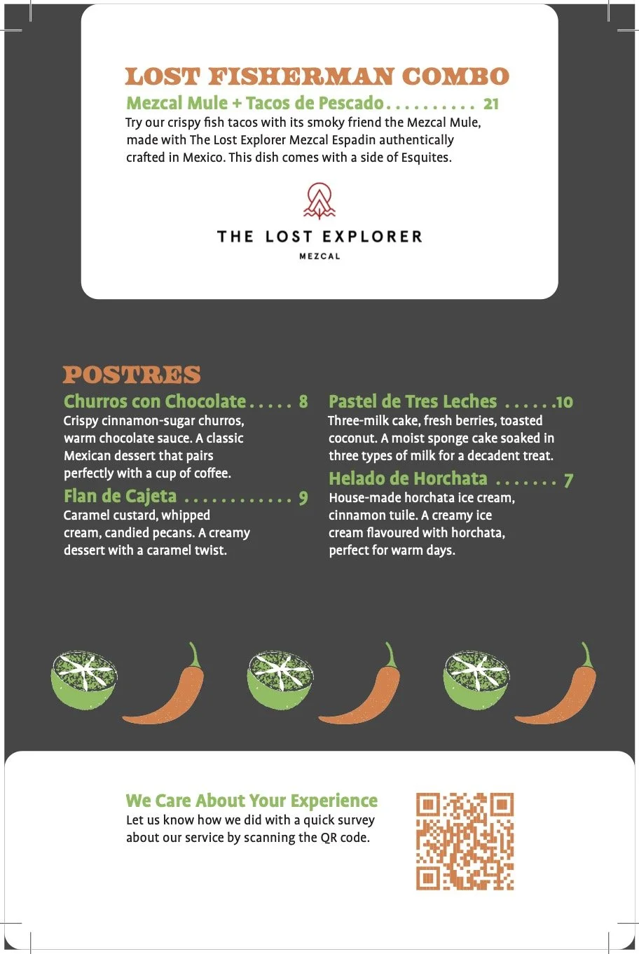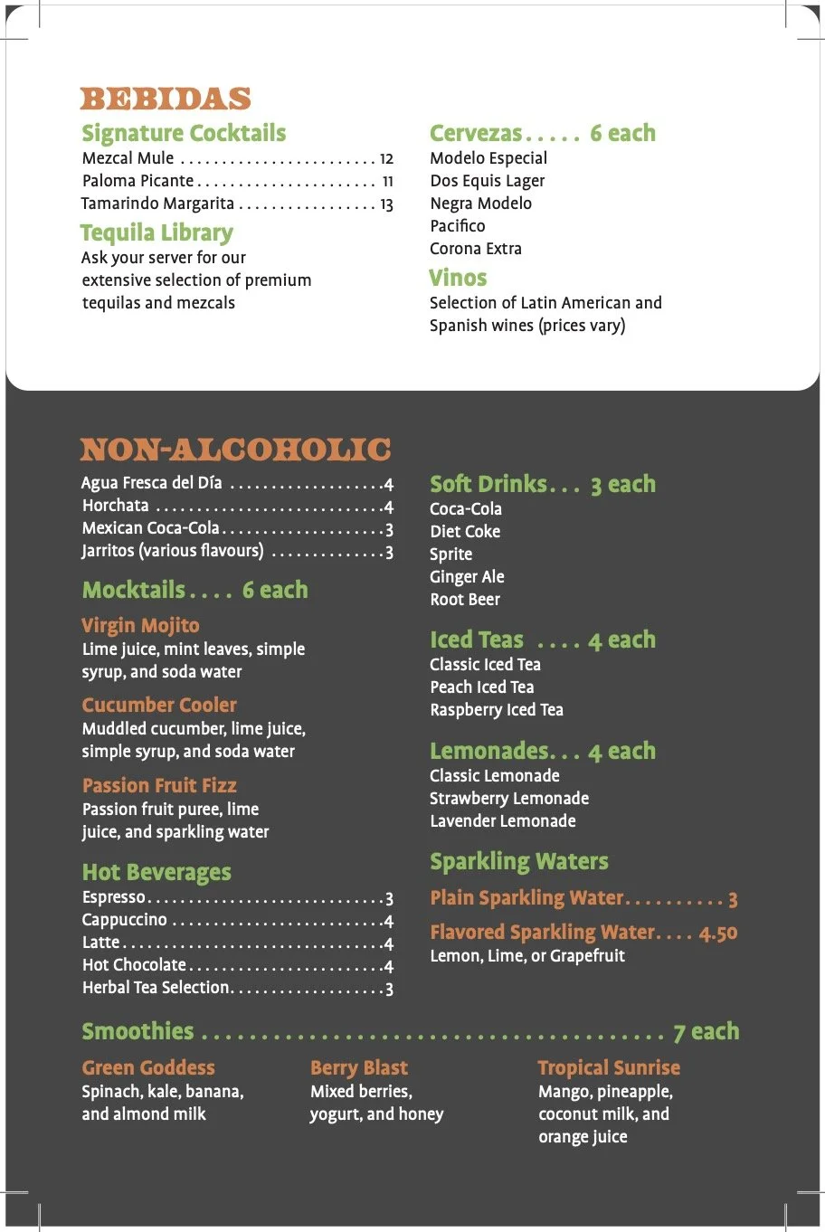 The same concepts were applied to the table menu, dividing the alcoholic and non-alcoholic beverages with contrasting backgrounds. A QR code was placed on the bottom of the table menu — requesting feedback from their customers — so the client’s business can continue to develop their services.