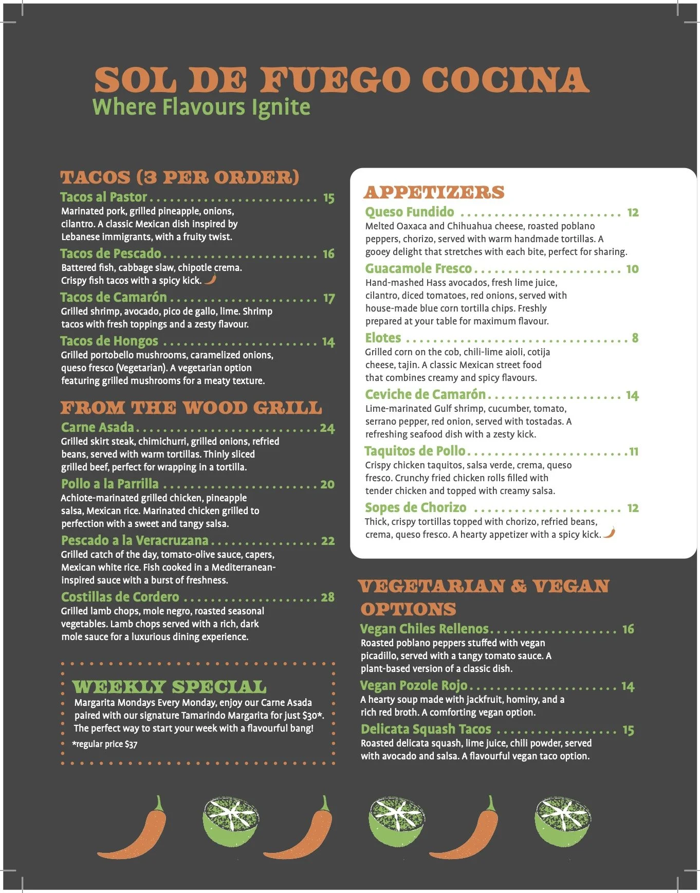 The vibrant orange and green colourway is inspired by the lime and chipotle flavours consistently used across this restaurant’s latin cuisine. Placing them on a charcoal background leaves a more vibrant impression, while reflecting the warmth of grilled smoky meals.