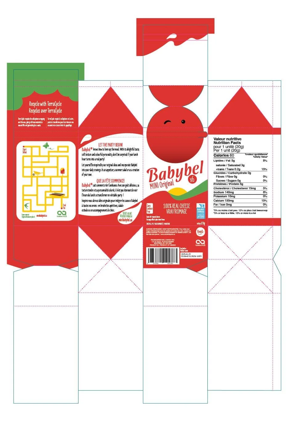Visual elements on the carton were pulled from previous branding elements from Babybel to allow for easy brand recognition after the changes being made. In order to further develop trust with the user, a callout on one side of the carton was utilized to direct them to the Babybel website. To develop a unique experience with their younger target audience, a maze game was included on the back of the carton, as well as information about their recycling partner, TerraCycle, to encourage responsible waste practices.